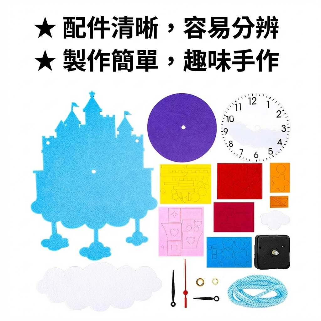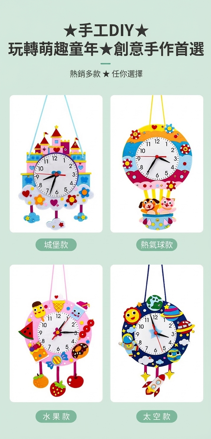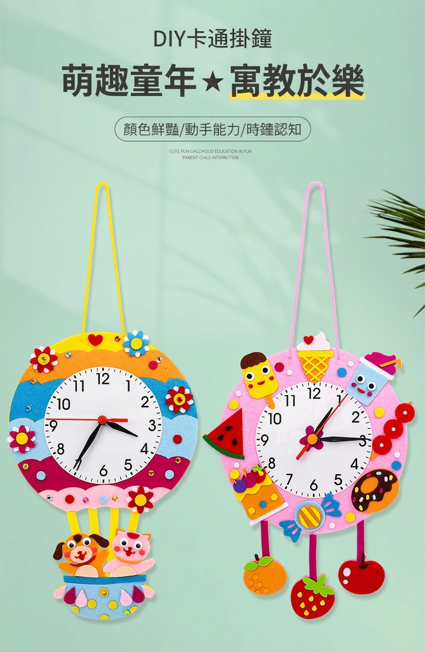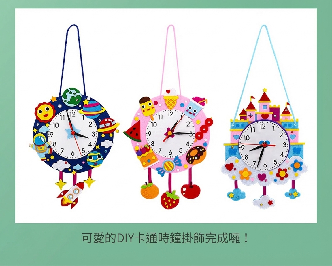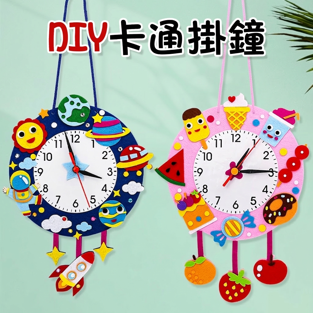 可愛卡通造型不織布時鐘DIY材料包,讓孩子邊做邊學認識時間。太空、城堡、熱氣球、冰淇淋等10款造型,附材料免裁剪,幼兒園教學活動及親子手工必備教具。