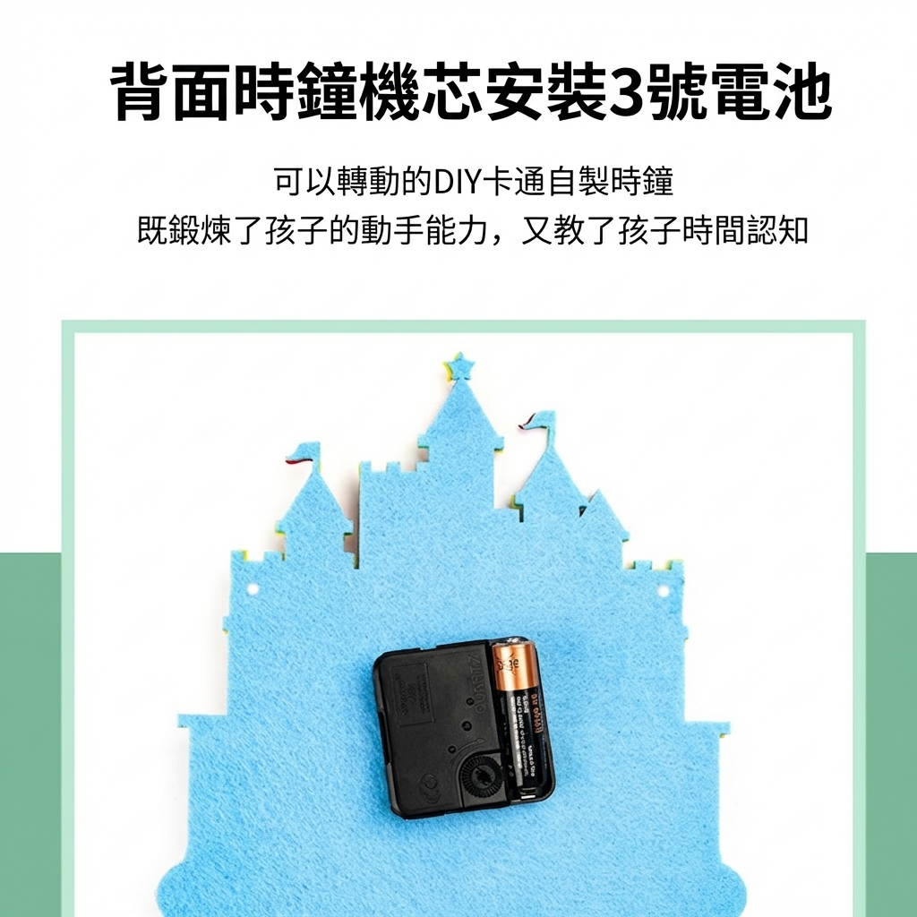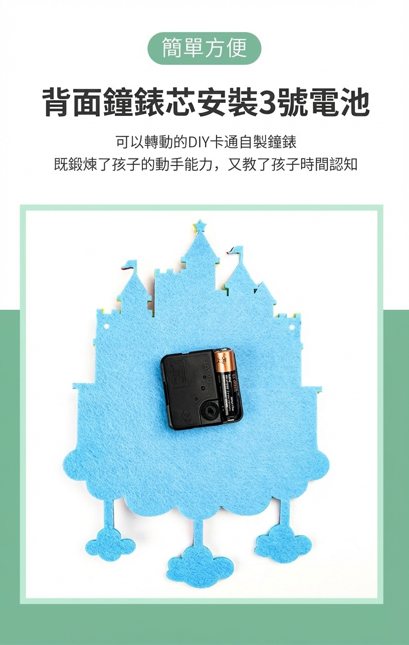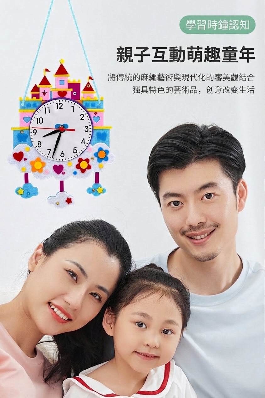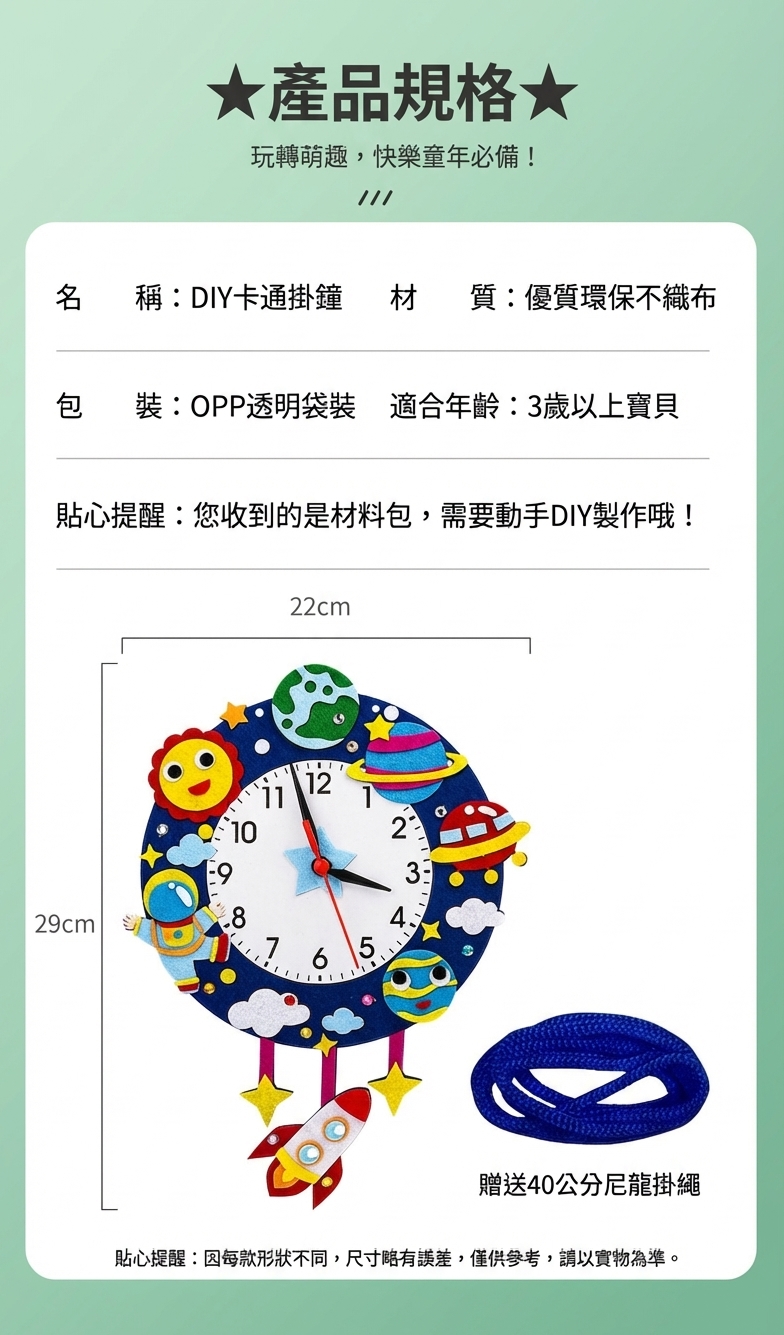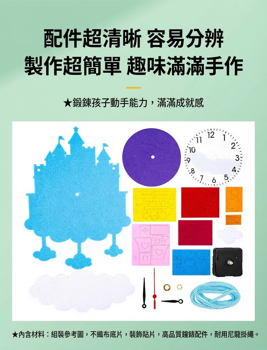 可愛卡通造型不織布時鐘DIY材料包,讓孩子邊做邊學認識時間。太空、城堡、熱氣球、冰淇淋等10款造型,附材料免裁剪,幼兒園教學活動及親子手工必備教具。